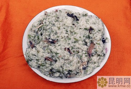 雞肉爛飯,佤族語稱“布安納亞”,是佤族菜譜中最著名的一道菜,也是佤族待客的上等佳肴,因其比稀粥要稠一些,有經過加工的雞肉混合,故俗稱雞肉爛飯。