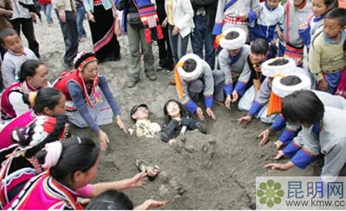 沙灘埋情人:傈僳族在他們的情人節的時候舉行的一項很有特色的民族活動。情人節是傈僳族青年男女的社交性節日,流行于怒江傈僳族。節期為農歷正月初四、初五兩天。