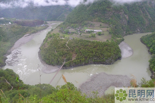 全長1540公里的怒江自青藏高原穿山越谷而來,在滇藏交界處的云南省貢山獨龍族怒族自治縣丙中洛附近轉了個半圓形的彎,被稱為怒江第一灣。這里的江面海拔約1700多米,氣勢磅礴,風光旖旎,水勢緩慢,兩岸風景獨好。東西往來的人常在此泛舟或坐溜索過江。
