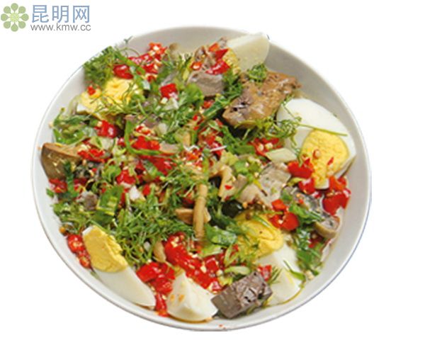 迤薩卷粉,是用紅米和白米勾兌加工成米漿后,人工蒸煮而成,色澤白里透紅,形成了迤薩卷粉的獨(dú)特性。很講究佐料,其中油辣、香芝麻、姜、蒜等必不可少。