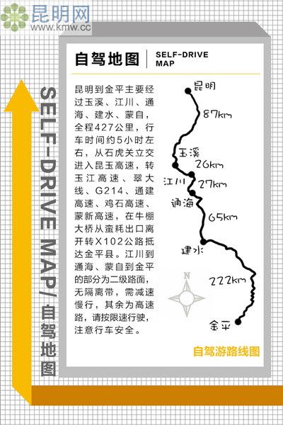 昆明到金平主要經(jīng)過玉溪、江川、通海、建水、蒙自,全程427公里,行車時(shí)間約5小時(shí)左右,從石虎關(guān)立交進(jìn)入昆玉高速,轉(zhuǎn)玉江高速、翠大線、G214、通建高速、雞石高速、蒙新高速,在牛棚大橋從蠻耗出口離開轉(zhuǎn)X102公路抵達(dá)金平縣。江川到通海、蒙自到金平的部分為二級(jí)路面,無隔離帶,需減速慢行,其余為高速路,請(qǐng)按限速行駛,注意行車安全。