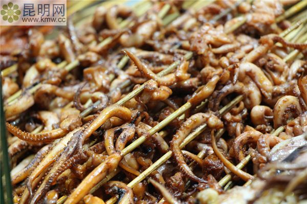 河口縣小吃的一大特色。小車上有一盆通紅的炭火,一旁擺著魷魚干。魷魚大小隨顧客自己挑,魷魚放到炭火上烤得焦黃后,再壓成又長又大的薄片,然后涂上黃皮醬、辣椒醬等作料,卷起來吃。