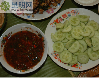 傣語對各種醬的統稱,其種類有“南泌布”(螃蟹醬)、“南泌帕”(菜子醬)、“南泌南諾”(酸筍醬)等近10種。最常見是“南泌帕”(菜子醬),把開花結籽的青菜棵舂細后裝入罐內腌四五天,發酸時去渣把酸汁倒進鍋里煮,煮到水份基本完時,取出曬干即成。食用時,加各種調料舂拌均勻,就可蘸其他鮮菜吃,也可以用糯米飯直接蘸吃,味道酸辣,開胃下飯。