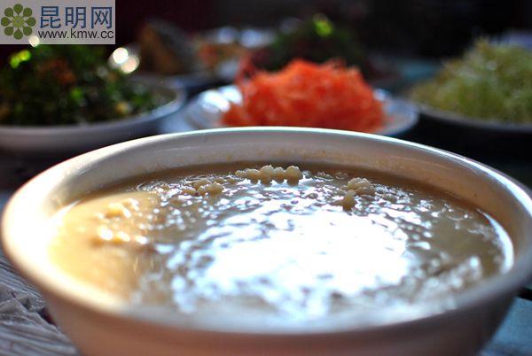 怒族的主飯食之一。大粒包谷砂用來煮稀飯,在鐵鍋或土鍋內一次放足水,用柴禾煮到2小時左右,待煮熟后再放上蔬菜之類,備些豆豉或辣子,吃起來味美香甜,開胃又解渴。