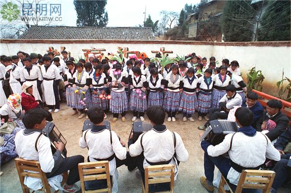 在富民縣小水井村教會,小水井合唱團的成員身著節日盛裝,齊唱贊美詩,迎接圣誕節的到來。具近百年歷史的小水井苗族合唱團,近幾年來先后在國內外進行了多種重大演出,蜚聲海內外。