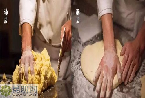 餅皮也是傳統的配方和工藝。采用兩種面團,一種酥皮,一種油皮。反復揉制,自然發酵。