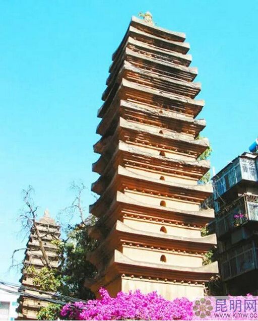 昆明的大德寺雙塔,很難打聽到。它倆相距20多米,密檐四角十三級,被夾在一片居民樓里,最近處距樓僅4米。