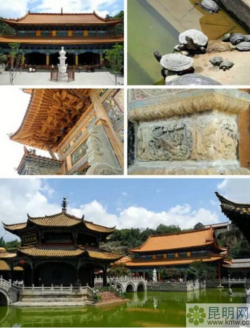圓通寺以造園手法建寺,青山、碧水、彩魚、白橋、紅亭、朱殿、彩廊交相輝映,景色如畫,是全國重點佛教寺廟之一。寺宇坐北朝南,富麗堂皇,整個寺院以圓通寶殿為中心,前有一池,兩側設抄手回廊繞池接通對廳,形成水榭式神殿和池塘院落的獨特風格。殿內供奉有清光緒年間精塑三世佛坐像,大殿正中兩根高達10余米的立柱上,各塑有一條彩龍,四壁還塑有五百羅漢像,均堪稱中國佛寺中的上乘之作。大觀樓長聯的作者孫髯翁,晚年曾在此地德咒蛟臺算懸掛為生。