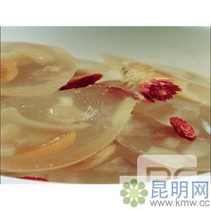 豬肉凍,是云南阿豬肉凍,是云南德宏阿昌族的風味涼菜。主要是利用豬頭、豬爪含膠質重的特點,熟制后加以冷卻凝固而成。嚼肉滑軟,苤菜根辛香。