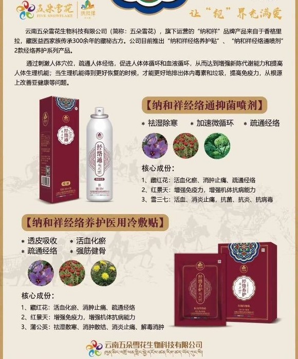 五朵雪花目前推出納和祥經絡養護醫用冷敷貼、納和祥經絡通抑菌噴劑2款產品。通過刺激人體穴位,疏通人體經絡,促進身體循環和血液循環,增強人體生理機能,排出毒素和垃圾,從根源上緩解疲勞亞健康,改善疼痛問題。